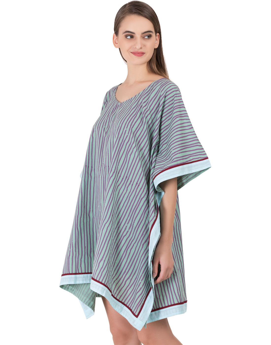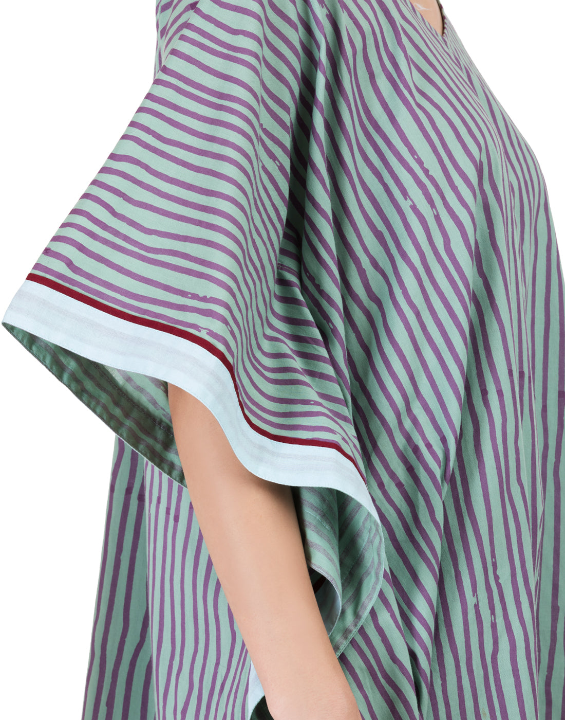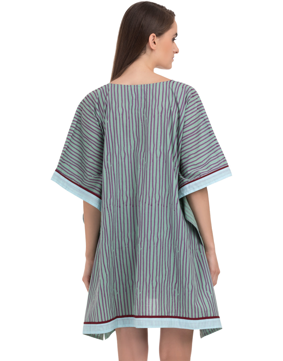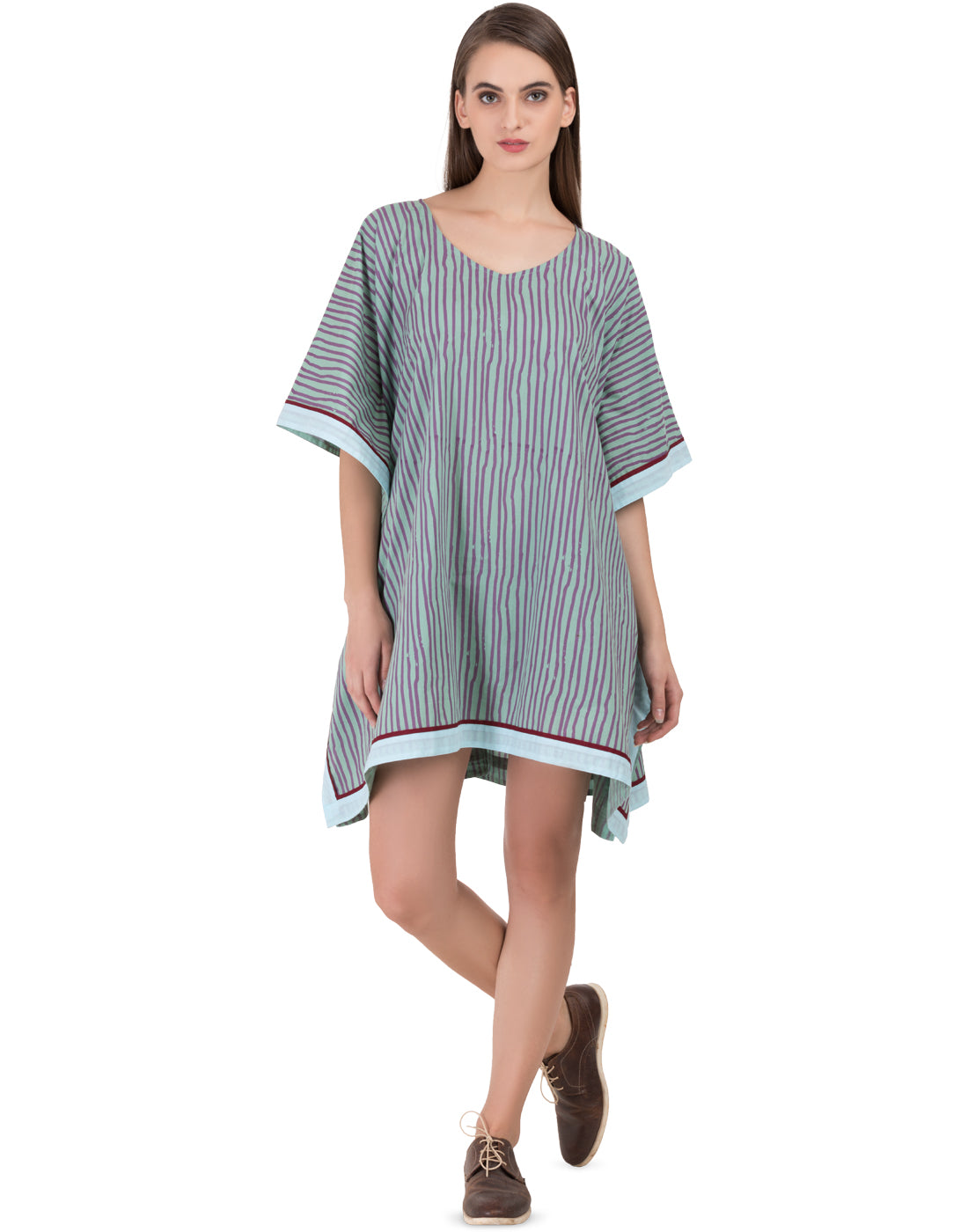 Step out in this carefree kaftan dress for an afternoon adventure. The tie-up at front and short kaftan sleeves give a unique edge to its silhouette. Fashioned from breathable cotton in an abstract hand screen print design, this classic yet smart piece is finished with a wide V-neck and contrast hems. Smarten it further by styling it over a pair of heels.