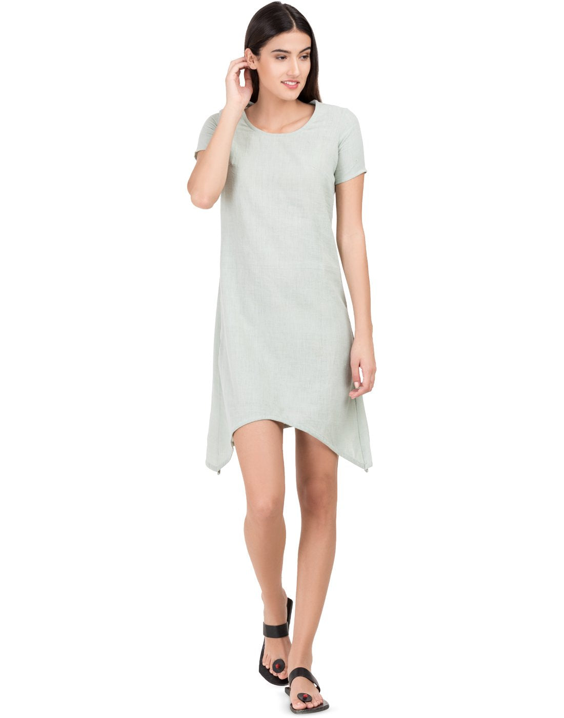Instantly update your look with this beautiful dipping dress. Crafted from light and comfortable Khadi it's detailed with a round neck, short sleeves and it falls to an asymmetric hem. Echo the boho vibe and wear yours solo or with palazzos and gladiators.