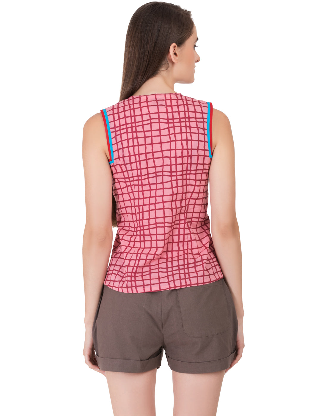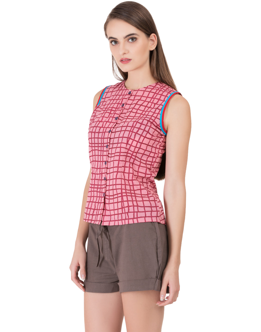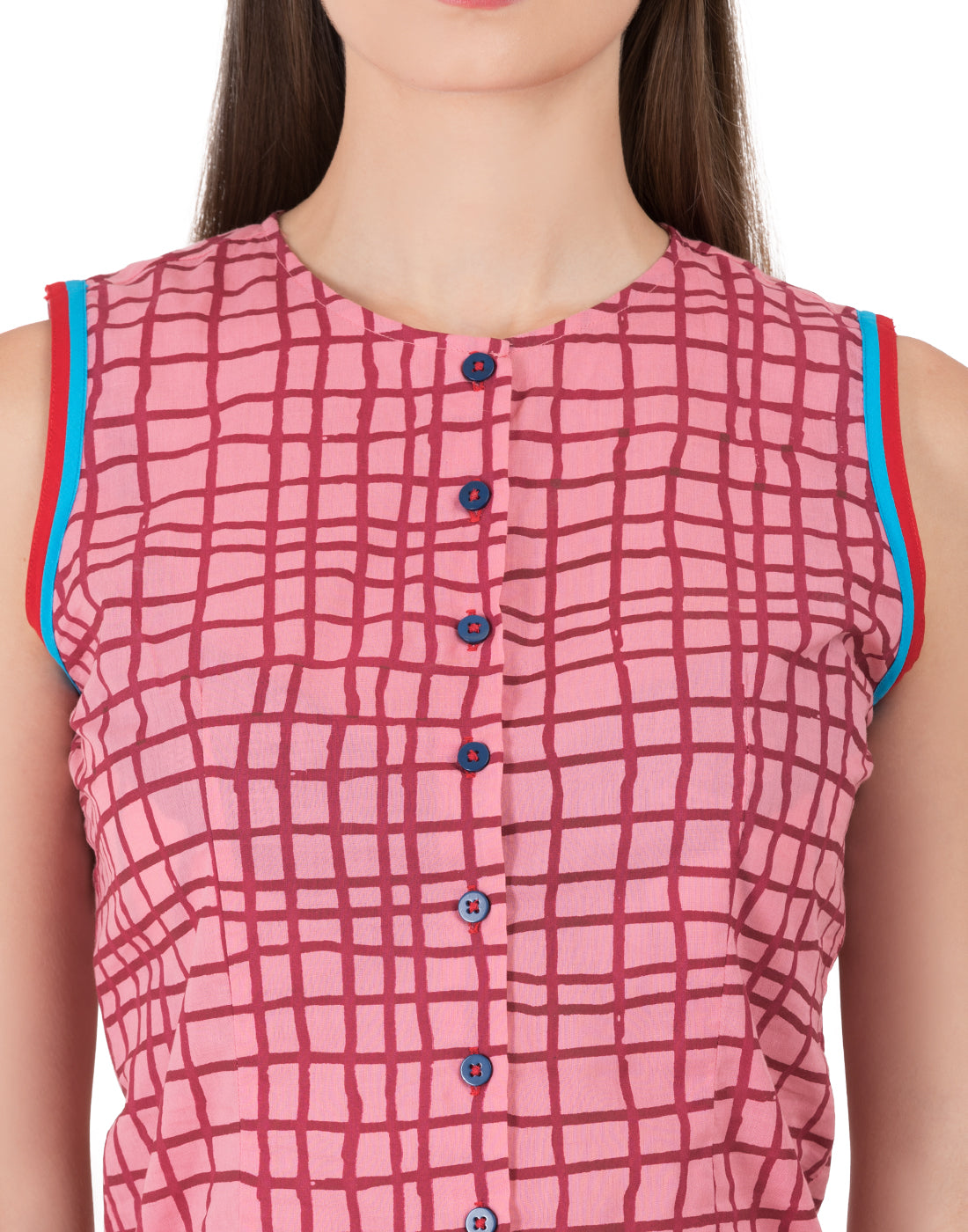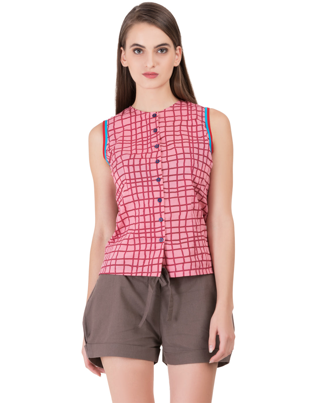 Woven from cotton and finished in a refreshing hue, this sleeveless tank top makes for a great addition to your off and on-duty staples. Boasting an abstract checkered hand screen print, this comfy piece is cut with a round neck, functional button placket down the front and contrast hue highlights at the armhole. Wear yours with chino pants and pumps for a perfect formal look.