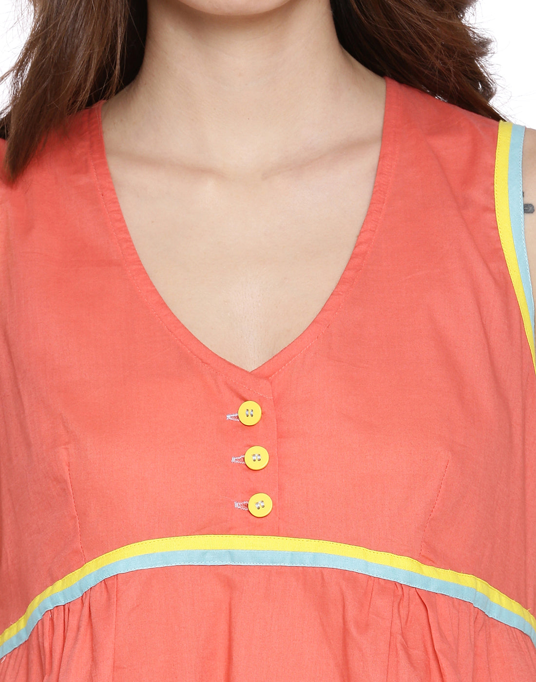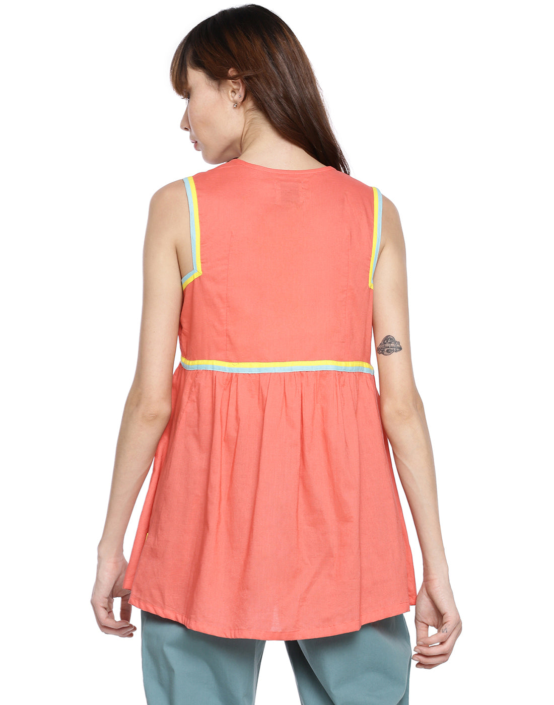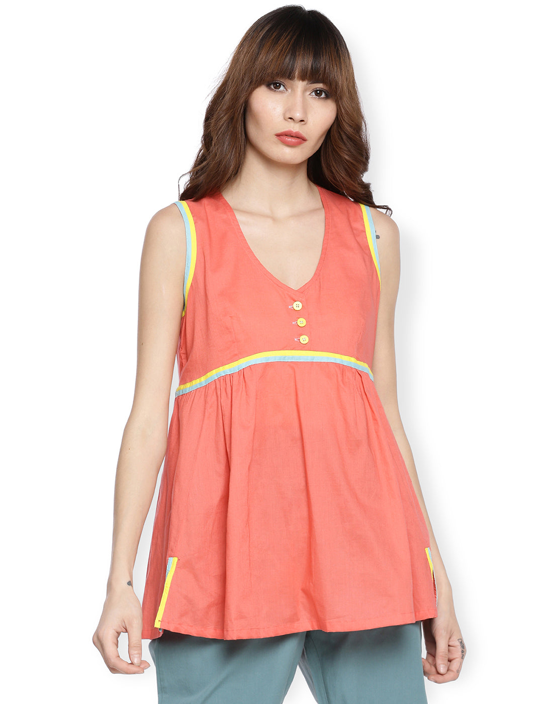 Stock-up on soft, supple pieces this season like this cotton tunic. This sleeveless piece with a square arm hole boasts a V-neck, three button placket, gathered yoke and has contrast taping at the right places. Wear yours with capris and flats for easy-going cool.